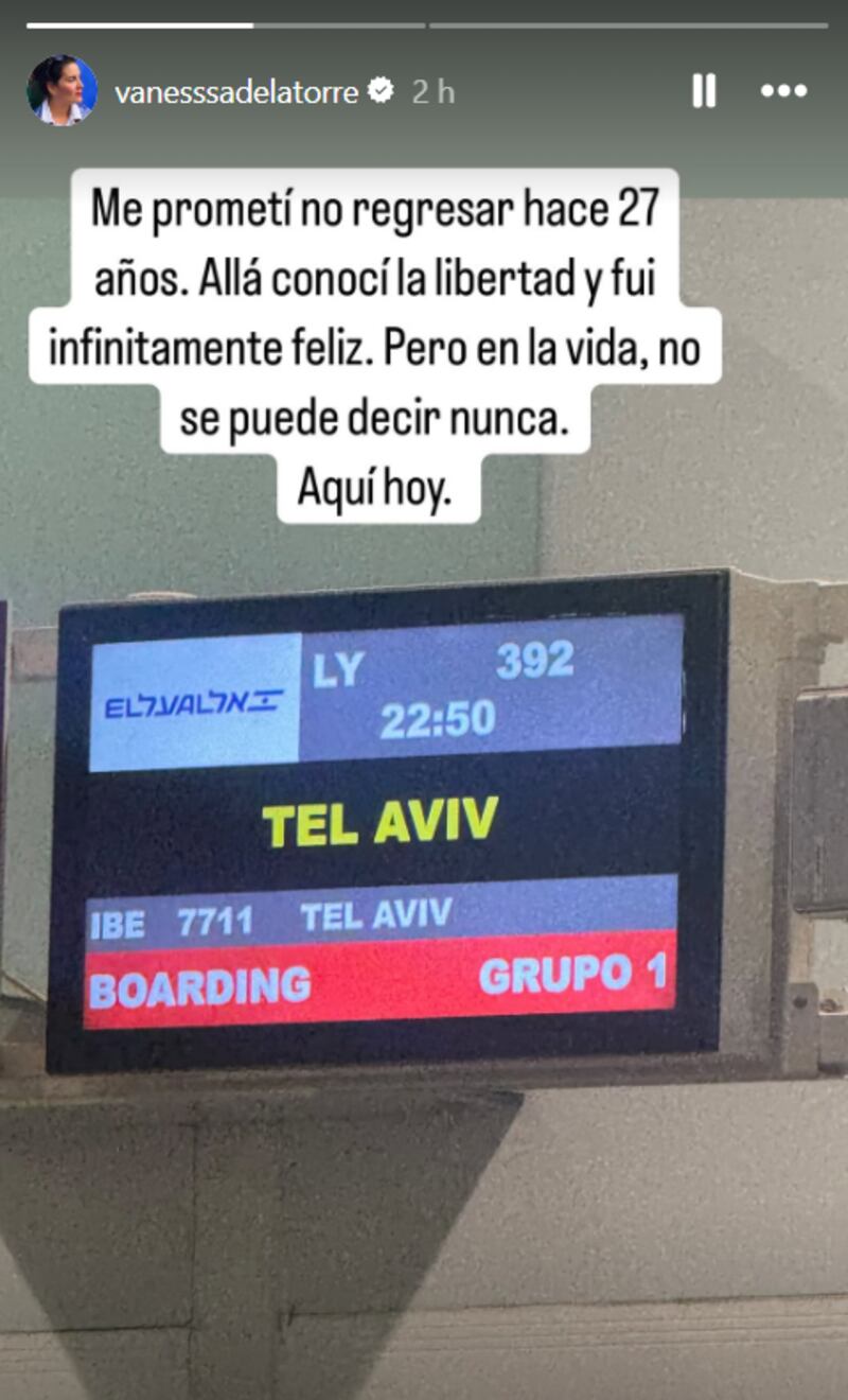 En sus publicaciones, la mujer que hizo parte de la nómina de Noticias Caracol junto an Juan Diego Alvira, mostró varias fotografías de su paso por el aeropuerto justo cuando iba a abordar su vuelo a la ciudad de Tel Aviv, Israel, imágenes acompañadas de la frase: “Me prometí no regresar hace 27 años. Allá conocí la libertad y fui infinitamente feliz, Pero en la vida no se puede decir nunca. Aquí hoy”.
