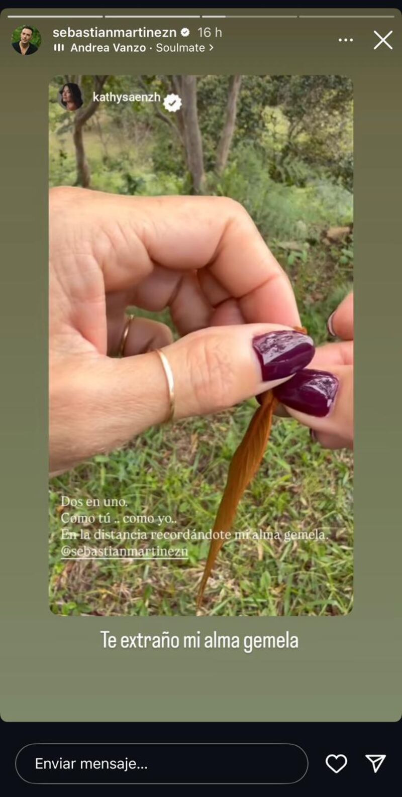 Sebastián Martínez y Kathy Sáenz evidenciaron por medio de sus redes sociales que llevan varios días distanciados, al parecer, porque el actor se encuentra llevando a cabo un nuevo proyecto, el cual tendría lugar en México. La primera en referirse a este tema fue Kathy, que disfrutando de su finca a las afueras de Bogotá compartió un corto video en el que una hoja de un árbol fue la protagonista, agregando así: “Dos en uno. Como tú, como yo. En la distancia recordándote mi alma gemela”.