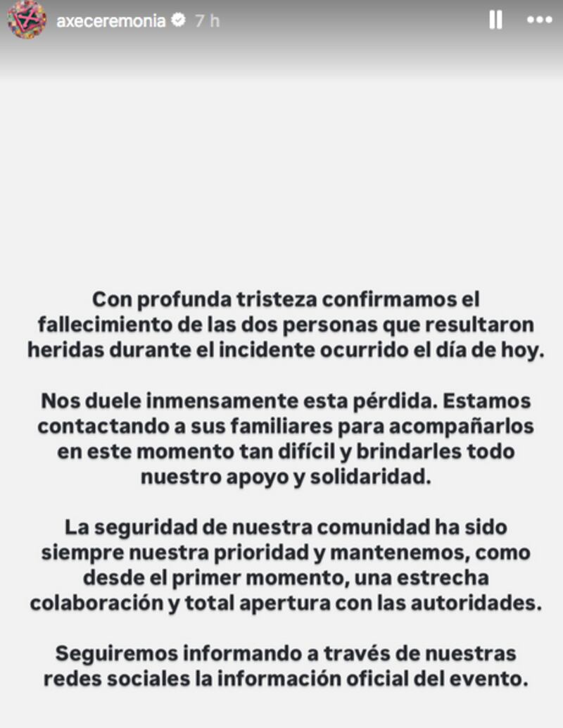 El propio festival emitió dos comunicados la noche del sabado, el primero solo señaló que las personas solo estaban lesionadas y más tarde, ya confirmó la muerte de los dos jóvenes.