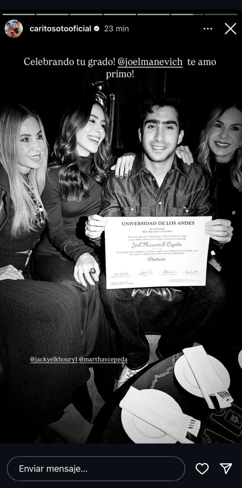 Uno de los más recientes tuvo que ver con la graduación de su sobrino, quien hace pocos días alcanzó el título como diseñador de la Universidad de los Andes. Por supuesto, las declaraciones en sus redes sociales no faltaron, demostrando así el cariño que le tiene: “Celebrando tu grado Joel Manevich, te amo primo”, agregó la presentadora de ‘Día a día’ añadiendo una imagen de este momento.