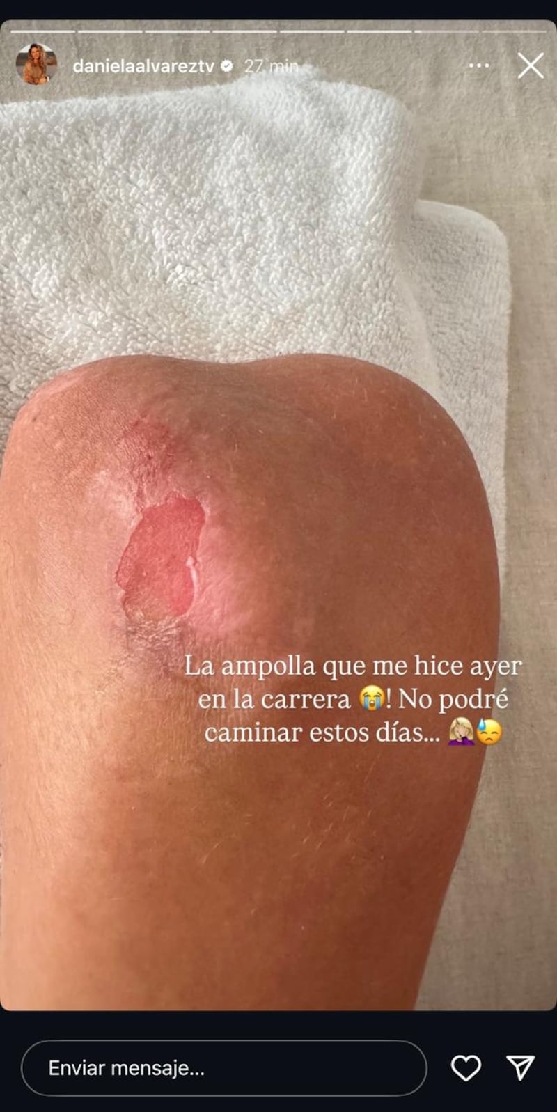 Posteriormente, Daniela Álvarez apareció en sus redes sociales para referirse a las secuelas que trajo consigo este esfuerzo físico: “La ampolla que me hice ayer en la carrera. No podré caminar todos estos días. Ahora es cuando pongo en práctica la paciencia”. Además de sus respectivas declaraciones, la presentadora compartió la foto de su rodilla mostrando la ampolla ubicada en esta zona.