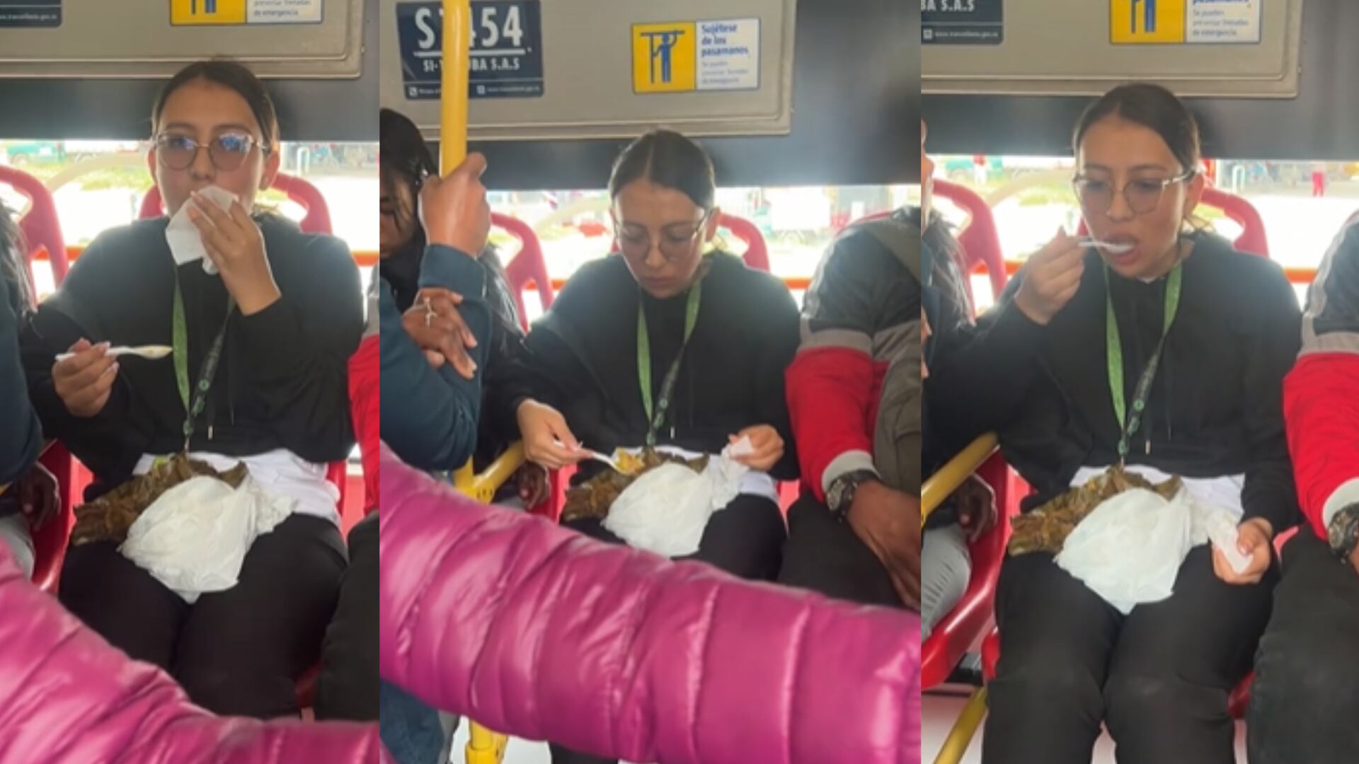 A la vista de todos y sin mayor pena, la joven consumió este alimento con total tranquilidad, pues el TransMilenio no se encontraba totalmente lleno. Cabe resaltar que el respectivo video estuvo acompañado de un clip viral con la voz de Bad Bunny en la que resalta: “Se los dije ya, que hay que empezar a preocuparnos menos y a disfrutar más porque la vida va rápido”.