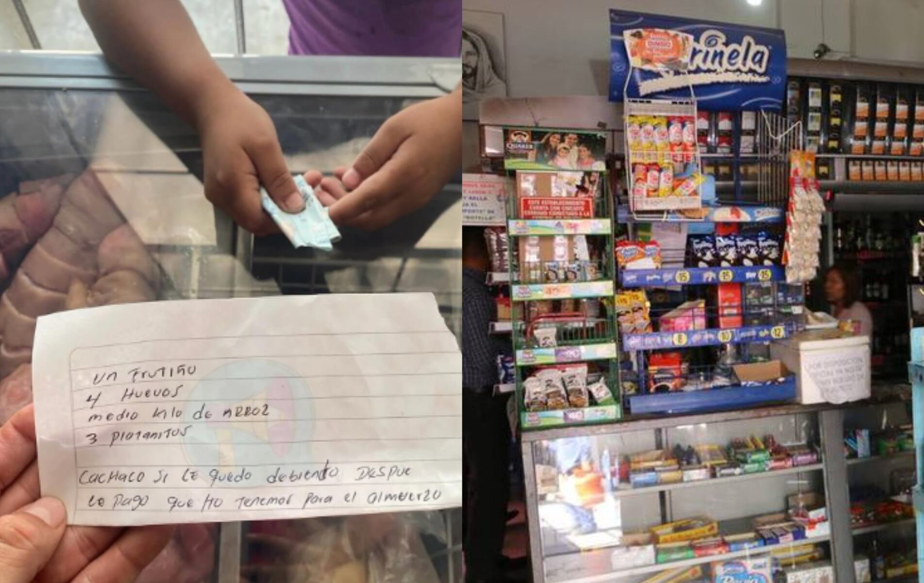 Una mujer, con solo dos mil pesos en la mano, escribió una nota para su vecino tendero pidiéndole fiado algunos productos básicos: “Un frutiño, 4 huevos, medio kilo de arroz, 3 plátanos. Cachaco, si te quedo debiendo después te pago, que no tengo para el almuerzo”.