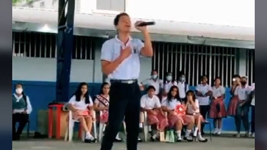 Su interpretación es completa, aunque su poderosa voz se pierde entre los aplausos y gritos de los estudiantes, un estudiante logró captar el momento y lo compartió en sus redes sociales.
