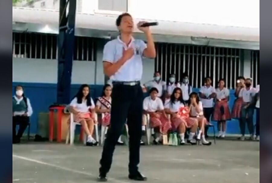 Su interpretación es completa, aunque su poderosa voz se pierde entre los aplausos y gritos de los estudiantes, un estudiante logró captar el momento y lo compartió en sus redes sociales.
