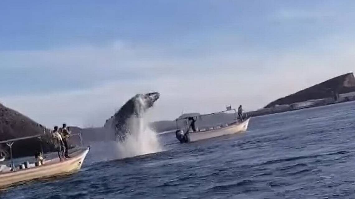 En el clip, se aprecia a una ballena jorobada que emergió el pasado fin de semana, para chocar y abalanzarse contra la proa de una pequeña embarcación.