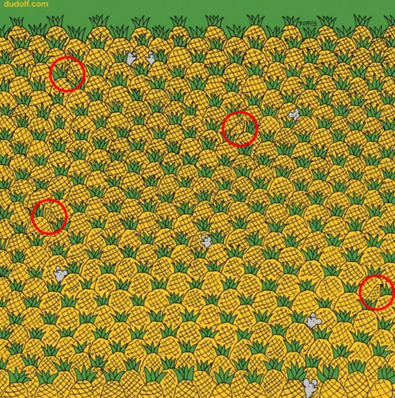 El primer obstáculo al que se deberán enfrentar los internautas con este reto visual será el abundante color amarillo en la imagen. A pesar que la piña y el maíz tienen gamas ligeramente diferentes, el artista conocido como Dudolf se encargó materializar cada elemento presente en el juego con el mismo tono amarillento, de modo que no se puede distinguir a simple vista cada objetivo.