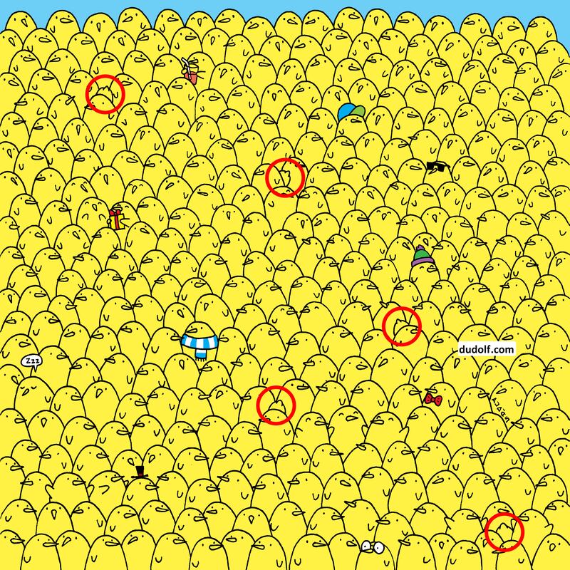 El artista Gergely Dudás, también conocido como ‘Dudolf’, decidió llenar una imagen cuadrada con una gran cantidad de polluelos aglomerados unos sobre otros. Todos presentan el color amarillo como tono predominante, dejando nada más algunas líneas negras para resaltar algunos detalles, e hizo exactamente lo mismo con los cinco limones escondidos entre ellos.