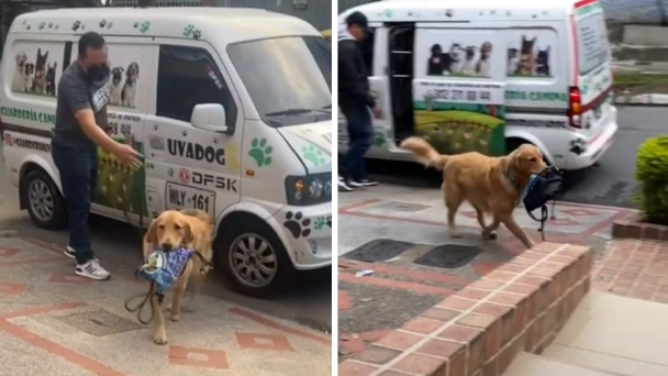 Pues en este particular tenemos un video que está dando de qué hablar, y tiene que ver con un Golden Retriever que lo llevan a la guardería en transporte canino y al regresar hasta baja del bus con su lonchera, tal cmo si fuera un niño de 4 años que es esperado a las puertas de la casa por su mamá.