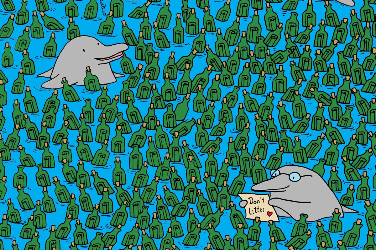 El artista de nombre Gergely Dudás, conocido en línea como Dudolf, publicó en sus redes sociales y en su blog un curioso juego en el que muestra a un trío de delfines en un mar lleno de botellas de vidrio. La mayoría cuentan con corchos, mientras que otras están abiertas en la parte superior.