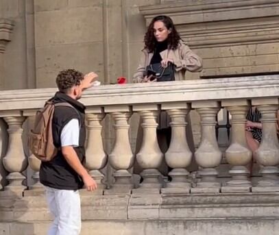 La chica está concentrada mirando su celular y de repente, Tony se acerca y le coloca la rosa sobre la cerca en la que ella estaba apoyada. Rápidamente, la chica se retira pensando que quizá era un ladrón o algún agresor.