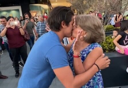 Parecen estar como en un centro comercial, donde la gente los rodea y anima al joven a besar a la señora de cabello gris. Lo graban y se ríen, mientras le preguntan si la mujer que lo acompaña es su pareja, a lo que él responde que sí.