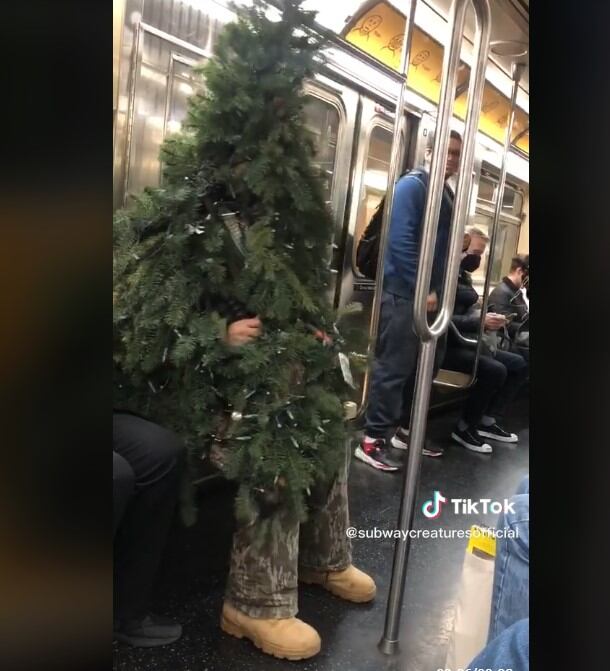 En la publicación se observa al hombre disfrazado de árbol de Navidad sentado en uno de los vagones del Metro de Nueva York. La gente alrededor lo observa y se ríe, la mayoría sacó sus teléfonos y lo grabó.
