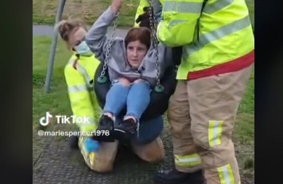 Finalmente, los bomberos logran sacarla. No se sabe cuánto tiempo estuvieron luchando para liberarla. Todos esperan que la jovencita haya aprendido la lección de que los columpios son para niños.