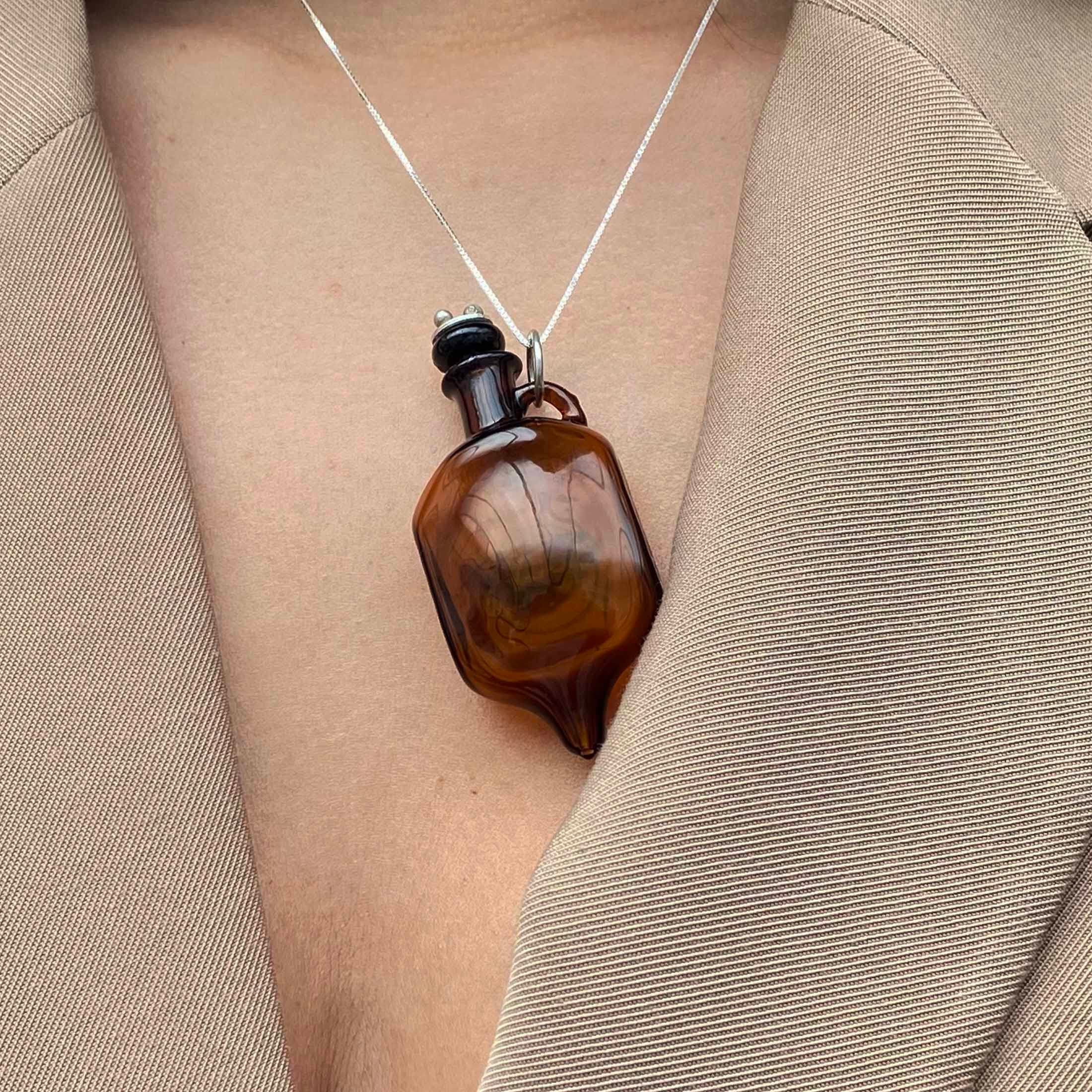 Es así como este amuleto cobra vida y se convierte en una propuesta infaltable para implementarse en la rutina diaria. En cuanto a la joya es creada con vidrio soplado artesanalmente, cadena y toques de plata ley 925 reciclada de radiografías la cual atesora un Serum aclarante e hidratante, enriquecido con CBD (Cannabidiol), Ácido Hialurónico, Vitamina C natural extraída del fruto amazónico de CAMU-CAMU, RONACRE VTA ® y Vitamina E.