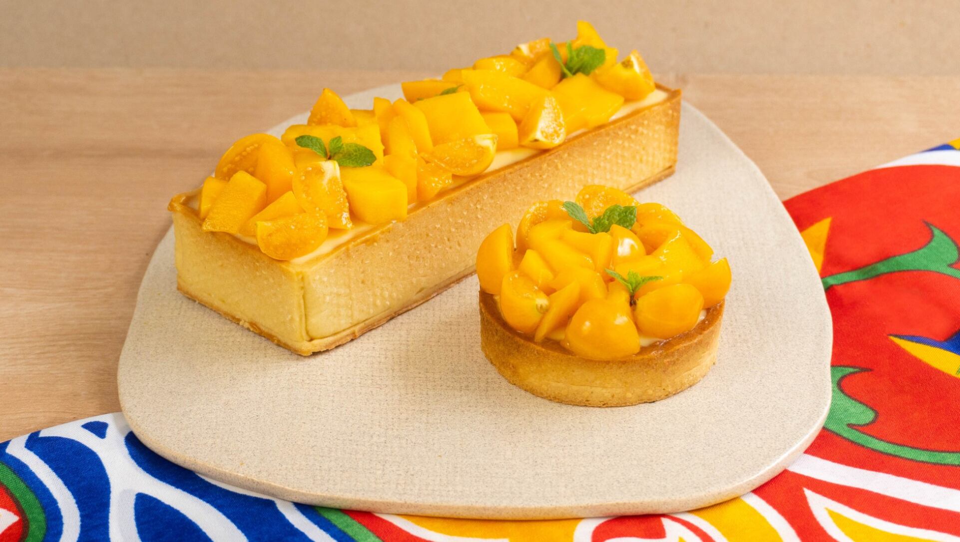 La flor de lulo es una tartaleta redonda de masa sablée con caramelo, panacota y compota de lulo cubierta de ganache de lulo y limón mandarino, coronada con unos pétalos lila: “Las hojitas de lavanda hacen alusión a esa pelusita morada que tiene el lulo”, dice.