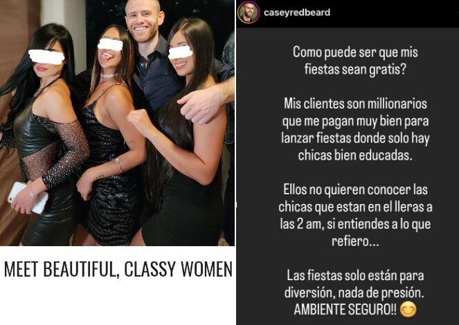 La organización Manifiesta logró identificar la captación de mujeres para extranjeros por varias invitaciones a fiestas que circulaban en Instagram durante el fin de semana pasado. De esta manera identificaron a quien sería el líder, que estaría cobrándole a extranjeros 600 dólares, cerca de 3 millones de pesos, por cenas, fiestas en lujosos apartamentos y viajes para conocer mujeres en Medellín.