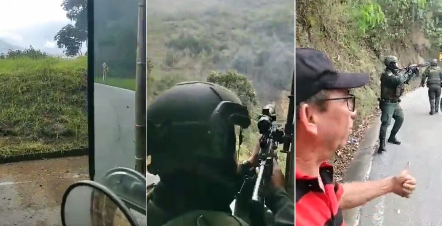 Una vez se acerca al uniformado, detiene el camión y se baja, y sin parar de grabar, sigue diciendo: “¡Santo Dios bendito!”. El conductor camina en dirección al policía, que está agachado y observando hacia una montaña, desde donde estarían recibiendo el ataque.
