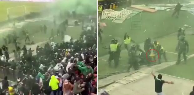 A través de las imágenes que se conocieron en las redes sociales se observa cómo el Esmad utilizó armas de dispersión contra los hinchas y uno de los policías usó un extintor para golpear en la cabeza a uno de los hinchas que había caído al suelo.