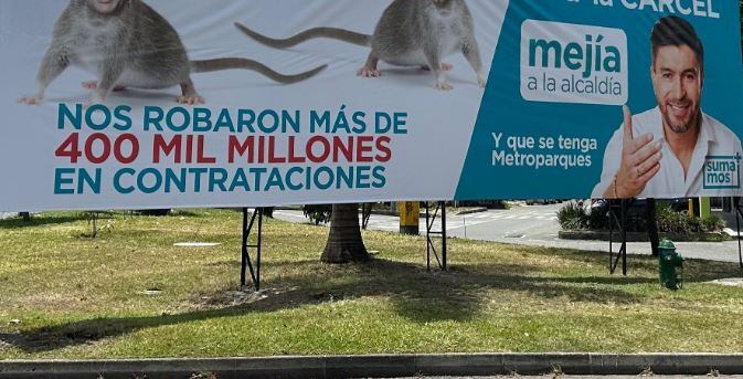 La valla, que hace parte de la campaña de Jaime Mejía, dice: “Vamos a acabar con las... nos robaron más de 400 mil millones en contrataciones. Se van pa’ la cárcel. Y que se tenga Metroparques. Mejía a la Alcaldía”.
