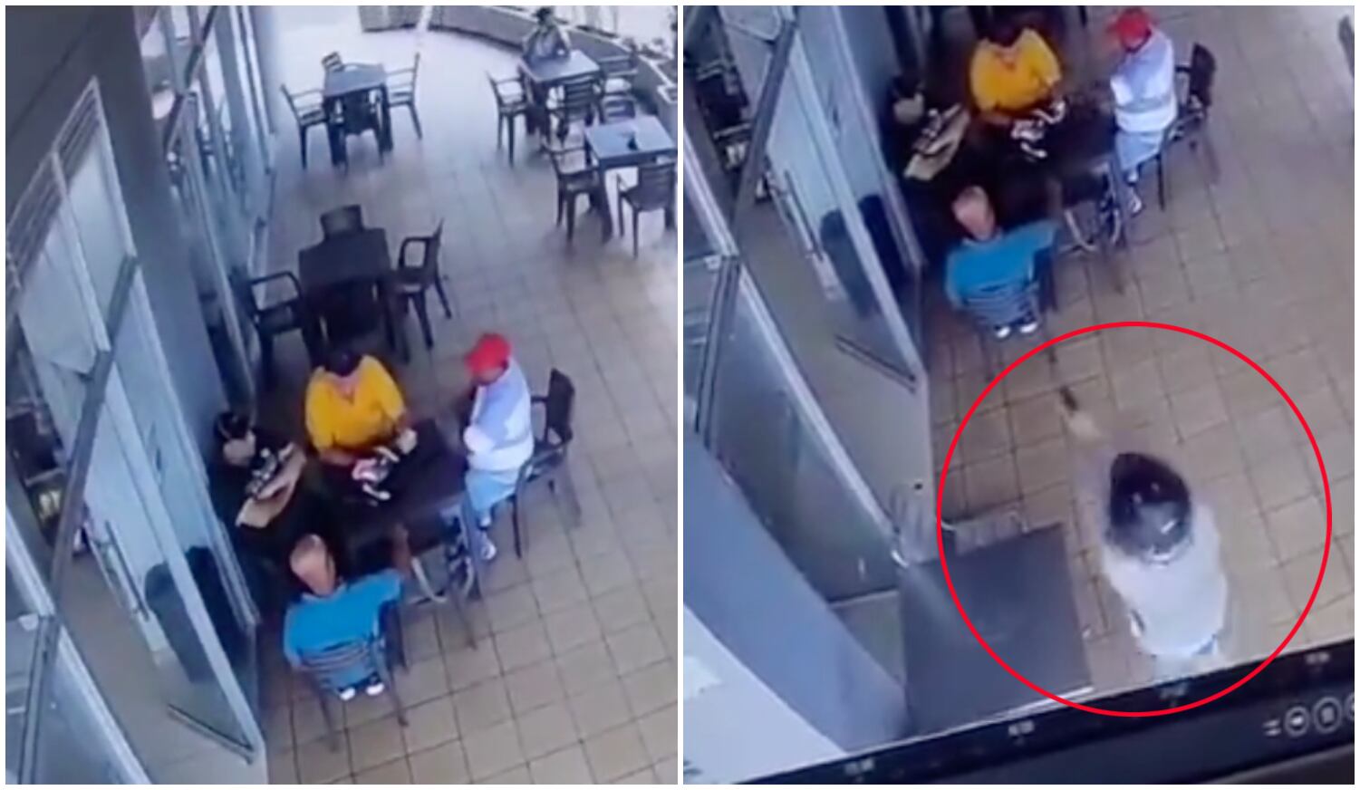 Según se ve en las imágenes, el criminal se acercó a una mesa donde había cuatro hombres conversando y abrió fuego contra ellos. El sujeto que se logró salvar de la balacera recibió un disparo en su mano, mientras que los demás quedaron tendidos en el suelo.
