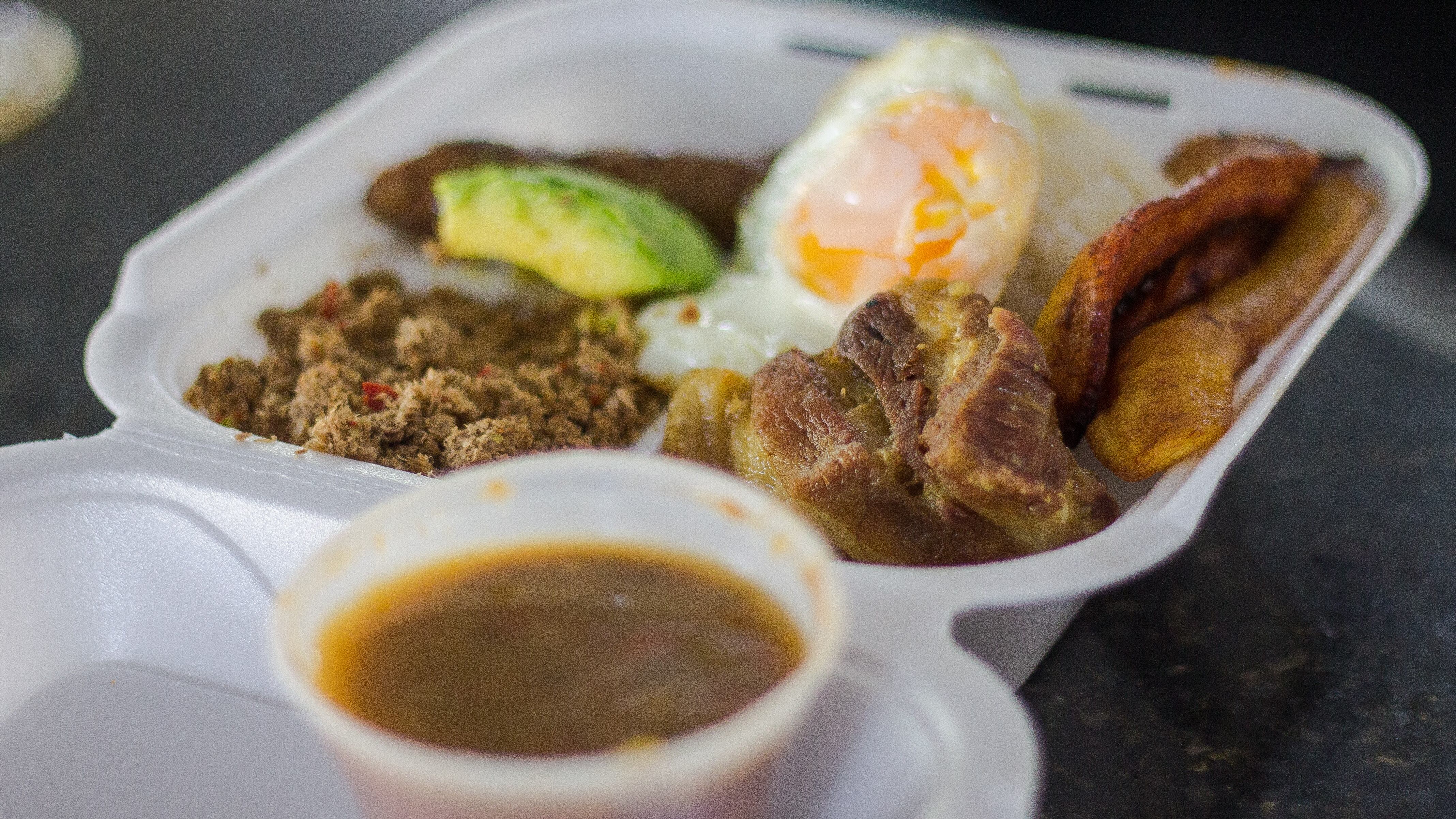 - Variedad de sabores y texturas que brinda la combinación de carne, chicharrón, arroz, fríjoles, arepa, plátano maduro y un huevo frito, que crea una explosión de sabor con cada bocado.