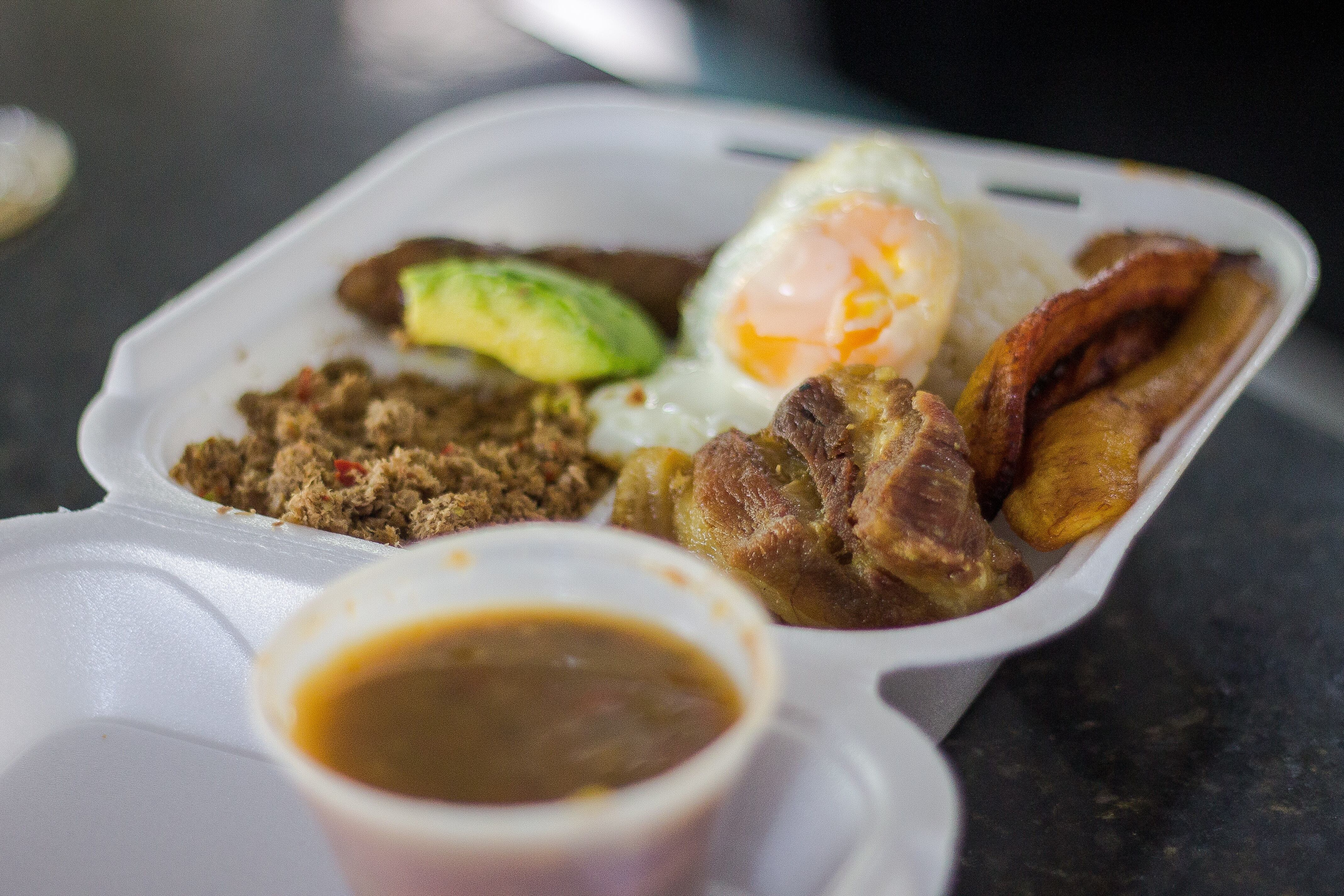 - Variedad de sabores y texturas que brinda la combinación de carne, chicharrón, arroz, fríjoles, arepa, plátano maduro y un huevo frito, que crea una explosión de sabor con cada bocado.
