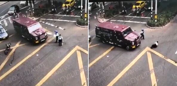 En las imágenes se observa el instante en el que en un cruce el vehículo de valores debe hacer un giro a la izquierda y, al parecer, no vio a los agentes de tránsito que estaban en la mitad de la calle en un procedimiento.