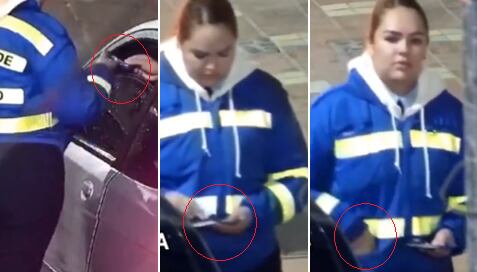 En las imágenes se observa que la agente se acerca a la ventana, el conductor al parecer le pasa los documentos del vehículo y en la parte de abajo están los billetes. La agente camina hacía la parte trasera del vehículo, cuenta los billetes y se los guarda en el bolsillo de la chaqueta.