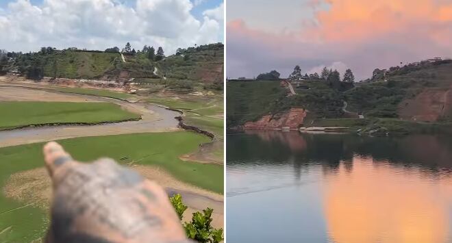 Cossio publicó un video a través del cual hizo una comparación sobre el estado actual del embalse de Guatapé, que para la fecha está prácticamente seco con unas imágenes anteriores en las que se ve la cantidad de agua que había.
