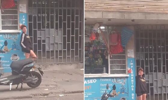 Al parecer, se percata que la están grabando y decide tocar el timbre del lugar y espera en la puerta a que alguien le abra, pero vuelve a ver hacía la cámara y la señala antes de irse.
