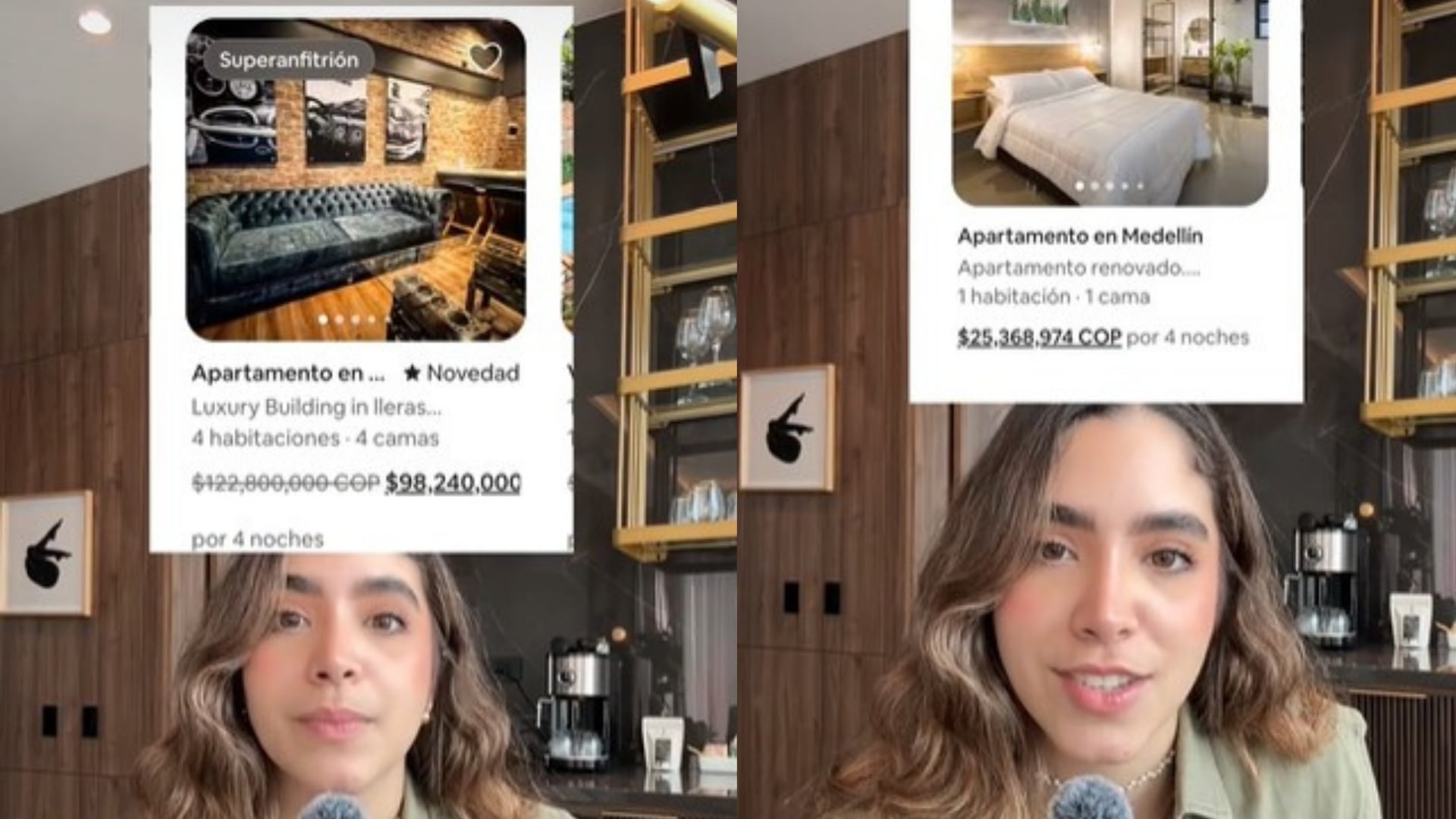 “Apartamento en El Lleras de lujo, cuatro habitaciones, 4 camas, 98.240.000 pesos. Dejo la imagen para que no crean que es mentira. Otro, apartamento en El Poblado, ático de lujo de 14 habitaciones, ok, 14 personas caben, ¡87.600.000 pesos! y por último tenemos un apartamento en Medellín, completamente renovado, 1 habitación, 1 cama, por 4 noches, ¡25.368.974 pesos!“, reveló.