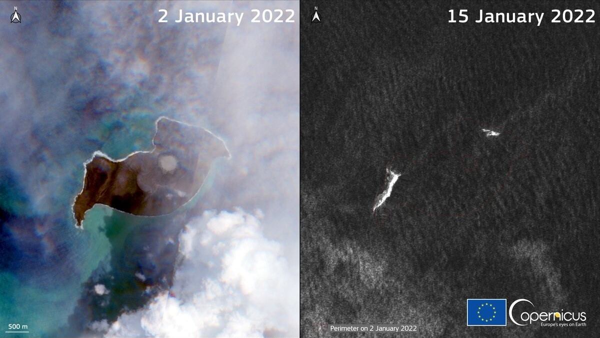 Esta área de tierra emergida en medio de Polinesia, creada por una erupción en diciembre de 2005, ya no existe, como se puede ver al comparar uuna imagen tomada por el satélite Sentinel 2 de la UE el 2 de enero, con otra del Sentinel 1 adquirida 12 horas después de la gran erupción, cuando la nube se disipó lo suficiente para observar la zona desde el espacio.