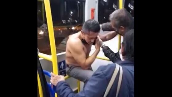 Finalmente se puede observar al conductor sin camisa mientras otro pasajero lo asiste con las heridas en su brazo poniéndole una venda.