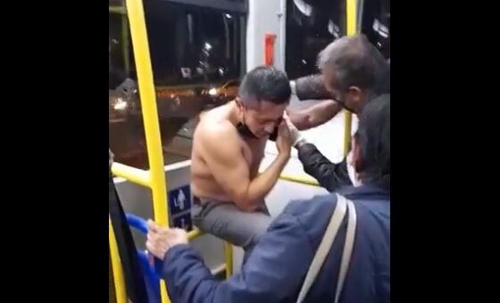 Finalmente se puede observar al conductor sin camisa mientras otro pasajero lo asiste con las heridas en su brazo poniéndole una venda.