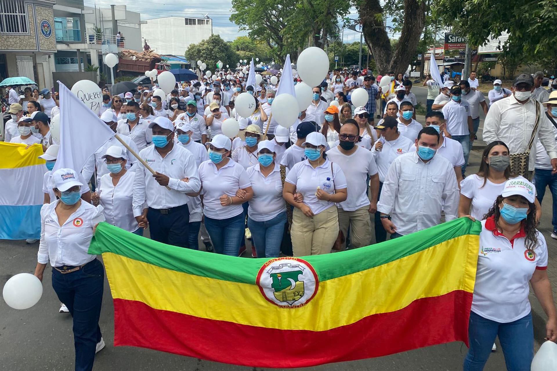 Habitantes de Saravena, municipio del departamento de Arauca, fronterizo con Venezuela, se manifestaron este viernes en las calles, vestidos de blanco, para rechazar la violencia guerrillera tras el atentado terrorista que dejó un muerto y cinco heridos.