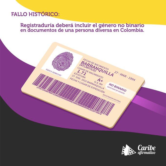 Caribe Afirmativo celebró este nuevo logro histórico del primer trámite referente a su registro civil y cédula de ciudadanía. Sin embargo, insistimos que este acontecimiento no puede representar un retroceso en materia de derechos para las personas no binarias, poniendo en peligro su identidad física y emocional.