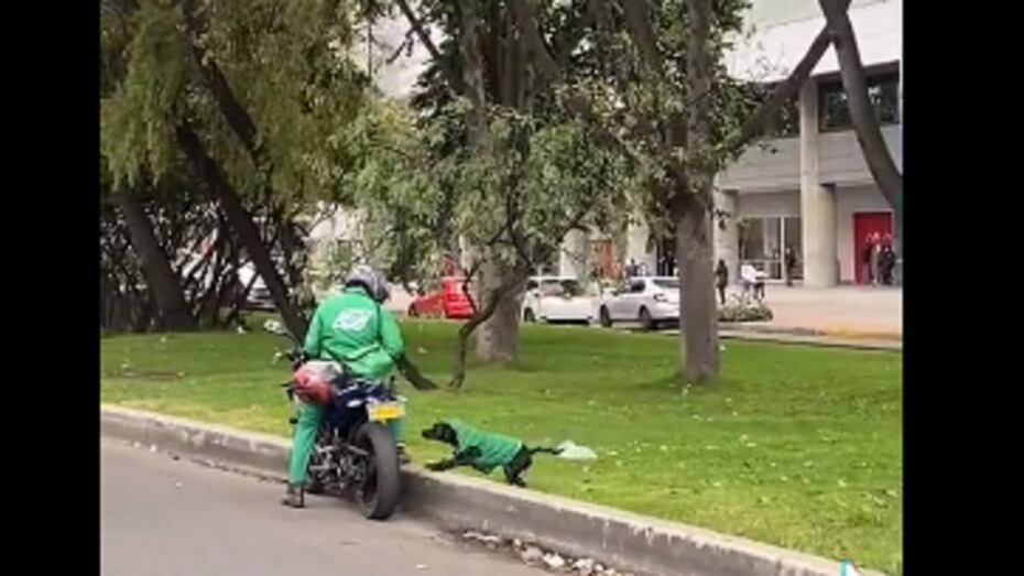 En el tierno video, lo que más llama la atención de la escena es que el perrito está vestido con un traje verde similar al uniforme del trabajo de su humano.