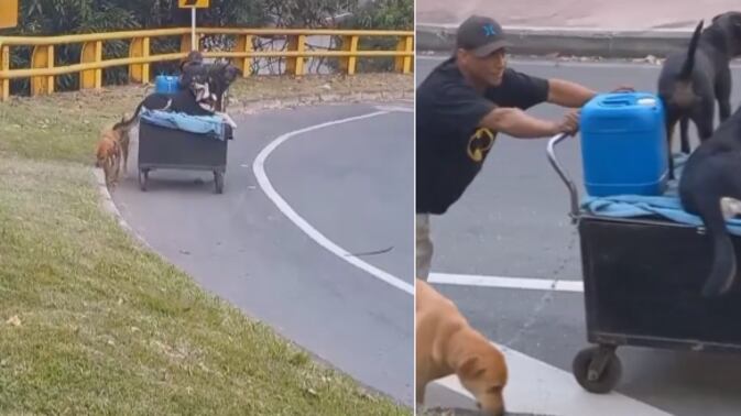 A través de un video publicado en las redes sociales se conoció el acto de un habitante de calle que con mucho esfuerzo empuja una carreta por una loma. Lo que llamó la atención es que en ella lleva varios objetos y a sus perros, todos de gran tamaño.