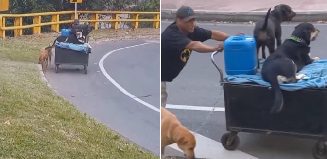 A través de un video publicado en las redes sociales se conoció el acto de un habitante de calle que con mucho esfuerzo empuja una carreta por una loma. Lo que llamó la atención es que en ella lleva varios objetos y a sus perros, todos de gran tamaño.