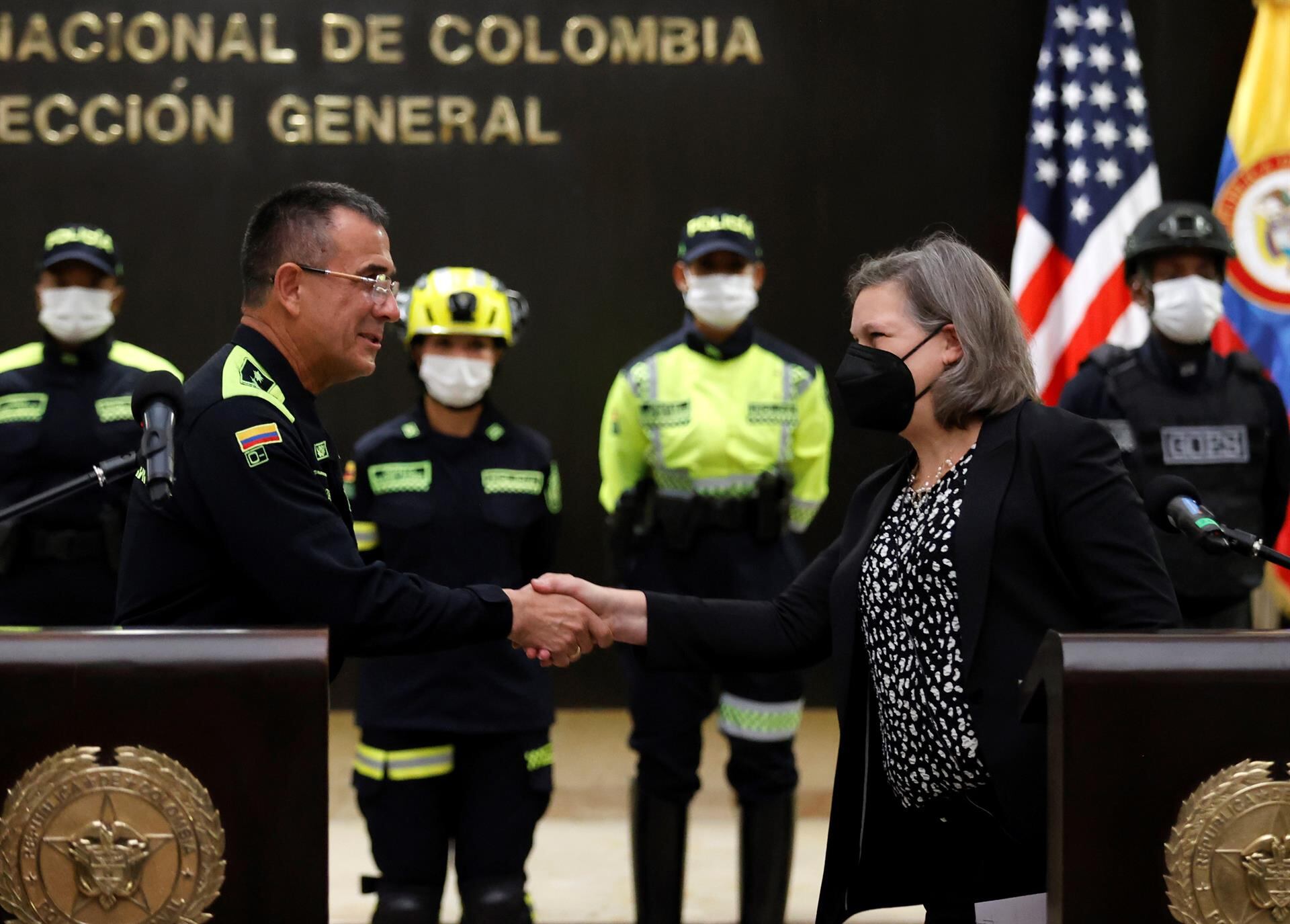 Como parte de su viaje a Colombia, Nuland se reunió con el director general de la Policía Nacional, el general Jorge Luis Vargas Valencia, junto a quien anunció en una rueda de prensa la donación que es muestra del “respaldo de la Casa Blanca al proceso de modernización” de las fuerzas de seguridad colombianas.