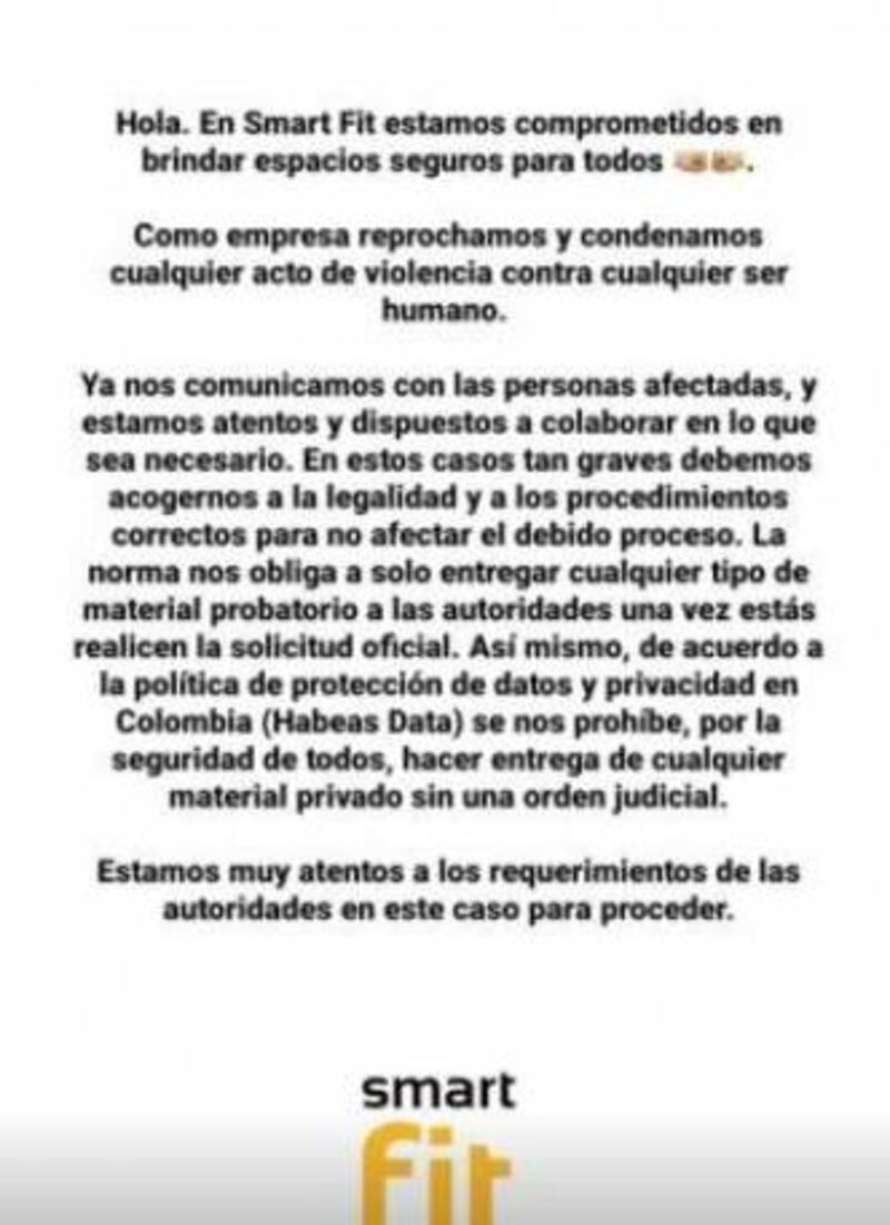 “Como empresa reprochamos y condenamos cualquier acto de violencia contra cualquier ser humano”, dice un mensaje publicado en las historias de Instagram del gimnasio.