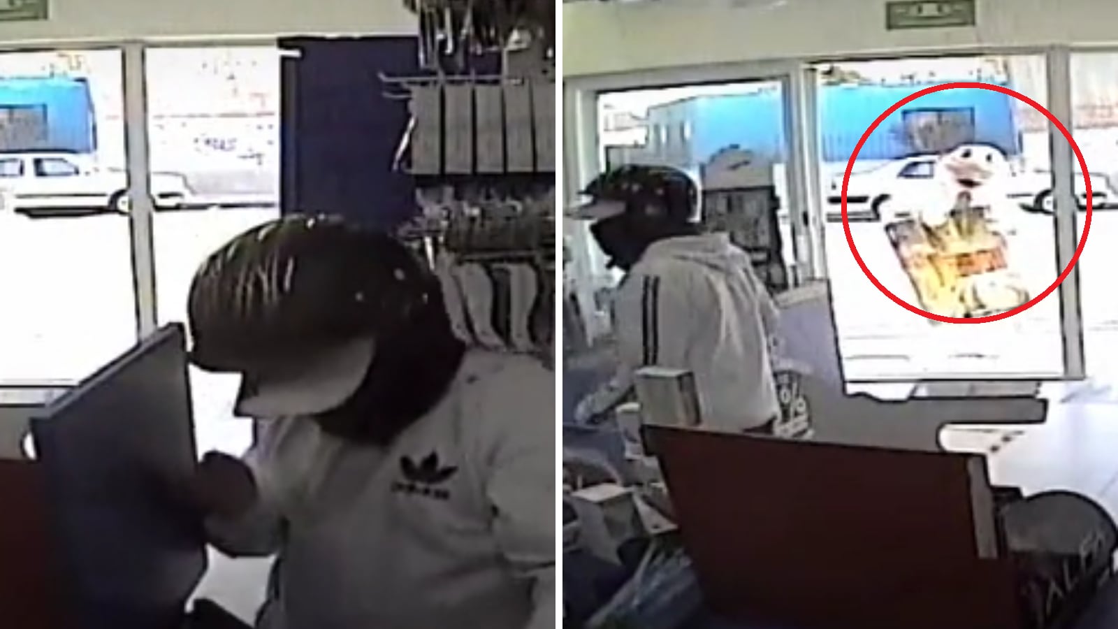 Sin embargo, no se había dado cuenta que el negocio estaba siendo víctima de un robo, por lo que continuaba su rutina como si nada, hasta que dio un giro y miró por el ventanal, para darse cuenta de lo que realmente estaba pasando.