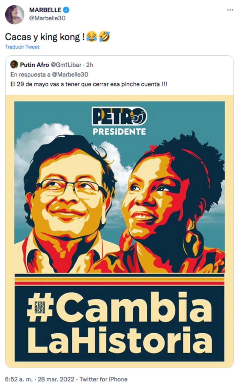 Cabe mencionar que el senador advirtió que Marbelle podría pagar tres años de cárcel por haberse referido de esa manera ante la candidata que hoy es la figura política con el segundo lugar en mayor cantidad de votos, desde las pasadas elecciones del 13 de marzo. Además, la cantante no se ha pronunciado públicamente disculpándose con la candidata vicepresidencial, sino que ha mantenido sus declaraciones argumentando que si a Iván Duque lo llaman ‘Porky’ entonces ella puede llamar ‘King Kong’ a Francia Márquez.