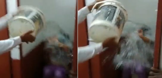 En las imágenes que se conocieron se observa como tres personas, dos vigilantes que salen en cámara y el que graba se acercan a la puerta del baño en el que se encuentra la mujer haciendo sus necesidades, uno de ellos levanta el baldado de agua, mientras que el otro abre la puerta y entre risas, le lanzan el agua.