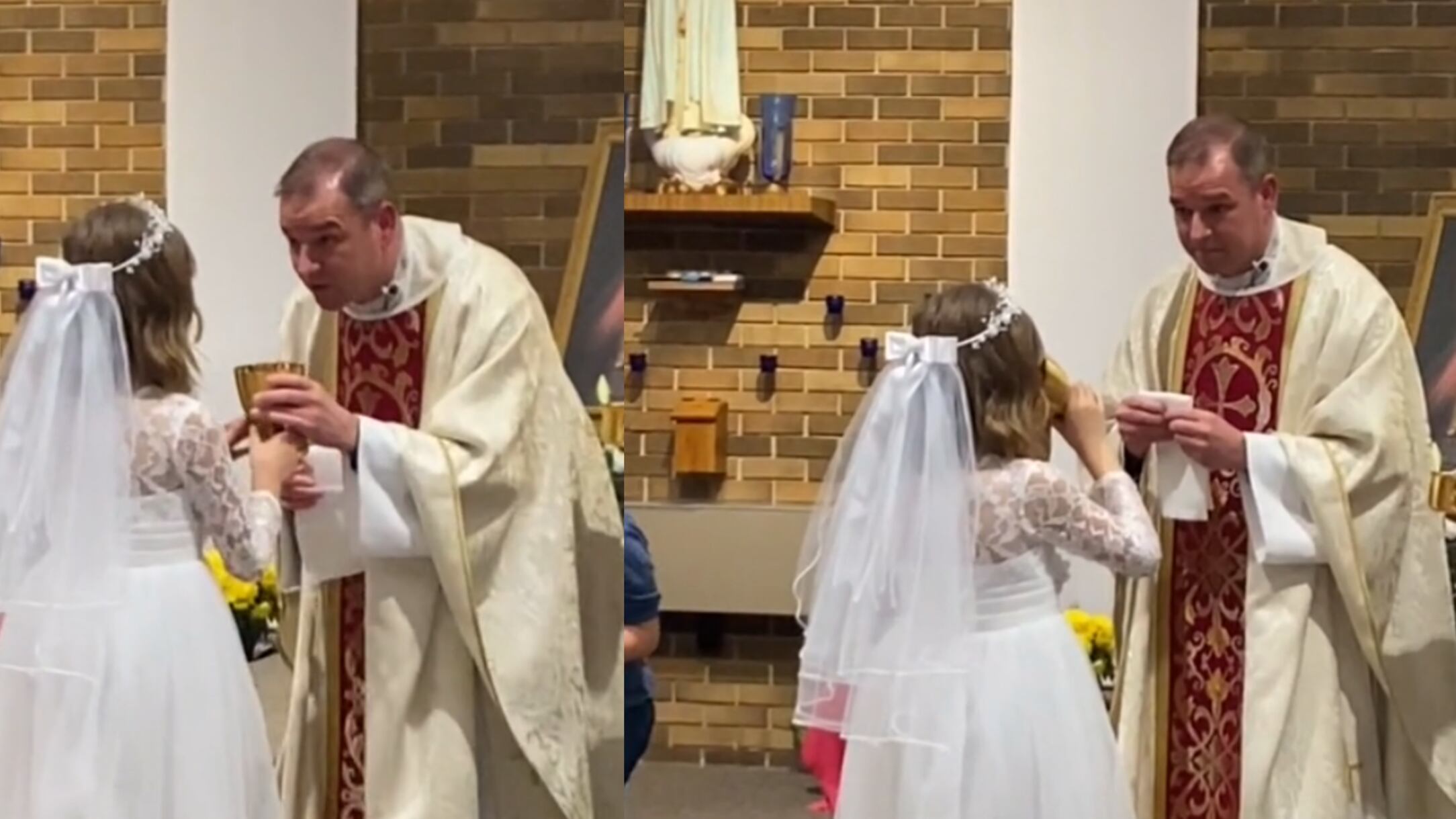 Varios usuarios en redes sociales han compartido el video de un gracioso momento en el cual se ve a una niña, al realizar la primera comunión, recibiendo la hostia y el vino consagrados por el sacerdote.