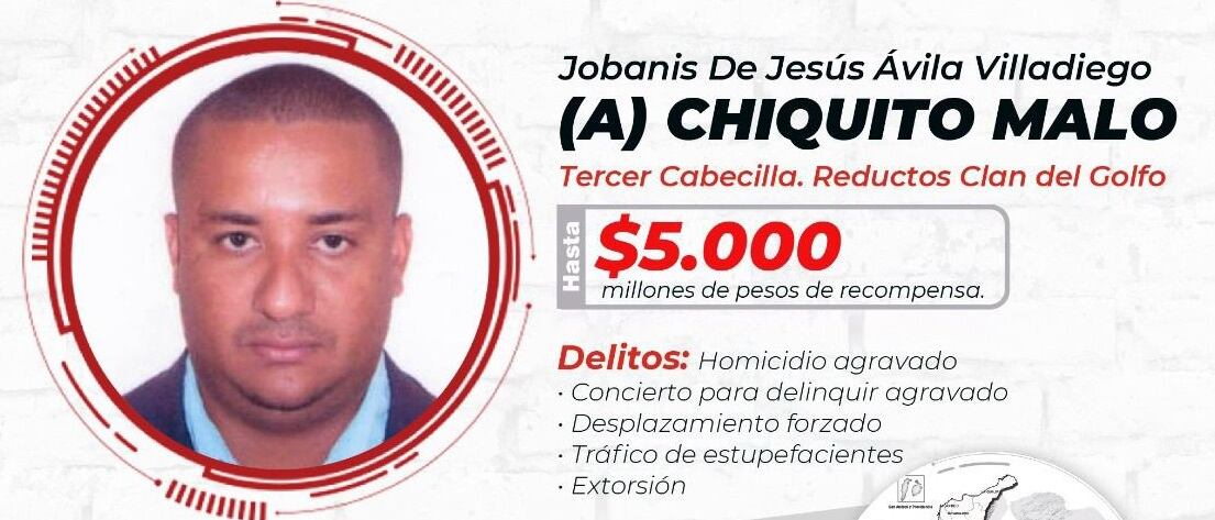 Cabe recordar que el Gobierno ofrece una recompensa de hasta 5.000 millones de pesos, por alias ‘Chiquito malo’ quien está identificado como Jobanis de Jesús Ávila Villadiego y tiene 42 años de edad.