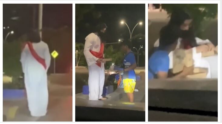 Un ‘Jesús’ muy colombiano reparte pizza a los más pobres en un semáforo. En redes sociales se hizo viral el video de un hombre que viste con una túnica blanca y con una tela roja similar a las representaciones de Jesucristo, cuya identidad es desconocida. Este personaje ha sido grabado varias veces por curiosos haciendo buenas obras con los más necesitados en Santa Marta.