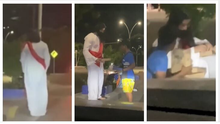 Un ‘Jesús’ muy colombiano reparte pizza a los más pobres en un semáforo. En redes sociales se hizo viral el video de un hombre que viste con una túnica blanca y con una tela roja similar a las representaciones de Jesucristo, cuya identidad es desconocida. Este personaje ha sido grabado varias veces por curiosos haciendo buenas obras con los más necesitados en Santa Marta.