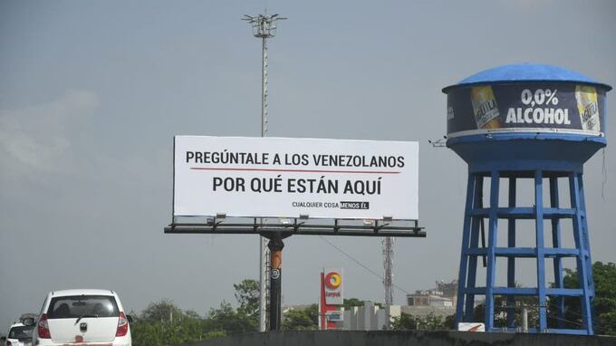 “Pregúntenle a los venezolanos por qué están aquí”, se lee en el aviso que en la capital del Magdalena fue ubicado en la Avenida del Ferrocarril con carrera 19. al final, en letra más pequeña, dice: “cualquiera menos él”.